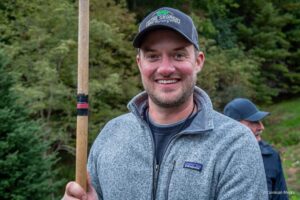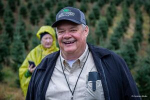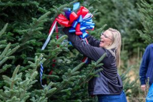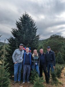 Siblings Alex Church and Amber Scott of Cline Church Nursery won the supreme honor of presenting a Fraser fir Christmas tree to the White House for display in the The Blue Room by competing in the National Christmas Tree Association’s Tree and Wreath Contest in summer of 2023. This contest marked the fifteenth time a North Carolina Fraser fir Christmas tree was chosen to be the centerpiece of the Blue Room, the most times a tree from North Carolina and a particular s pecies have been featured from any state. On October 9, 2023, White House staff traveled to Fleetwood to select the perfect Christmas tree for the Blue Room. After looking at six great choices of 18-21′ Fraser fir trees, Senior Groundskeeper Dale Haney and Chief White House Usher Robert Downing chose a 19′ Fraser fir that Alex had planted while he was in high school, making the choice even more special. Friends, family, industry peers, neighbors, dignitaries, and members of the Fleetwood community gathered to watch as Alex Church harvested the 19′ Fraser fir. “I got to cut it. It was great,” Church exclaimed. “it looked bigger (cut down) than it did over there standing up!”